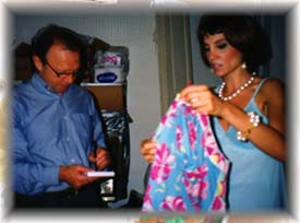 | Terror Firmer is my current favorite Troma Film. It's Lloyd Kaufman being even more daring, bold and original. He portrays a blind director on a set gone amuck. Only in Tromaville, only in Tromaville. Although my part as Casey's mom is small, I loved the opportunity to be a part of this production. I had flown in the night before from Geneva and barely got in Terror Firmer at all. I put the outfit together using a vintage slip (that explains the pointed breasts) and an orginal Pucci top. The costume jewelry was compliments of my sister. | |